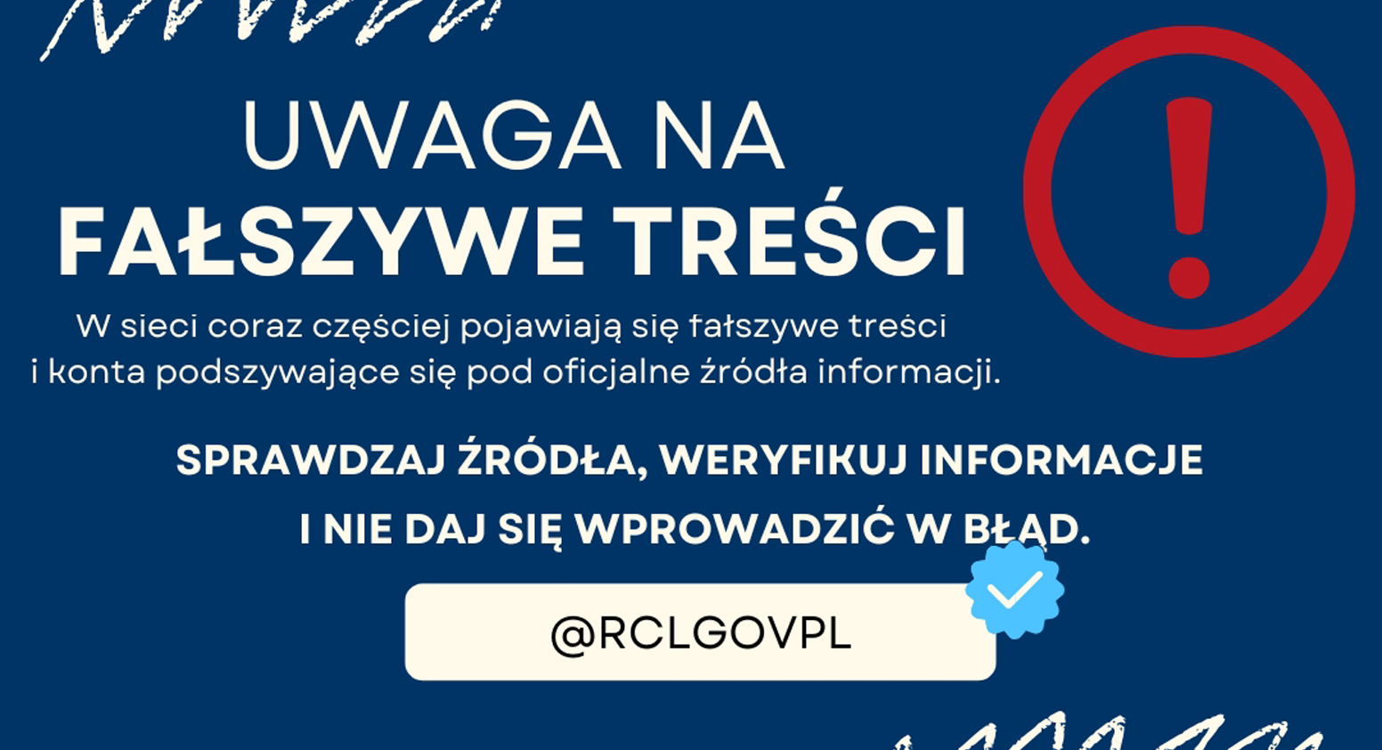 W ostatnim czasie w internecie pojawiają się fałszywe treści oraz konta, które mogą wprowadzać w błąd podszywając się pod oficjalne źródła informacji publicznej. Takie działania mogą prowadzić do rozpowszechniania nieprawdziwych lub zmanipulowanych komunikatów, które nie pochodzą od instytucji państwowych.