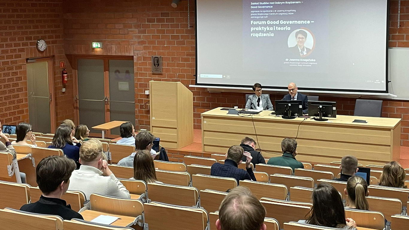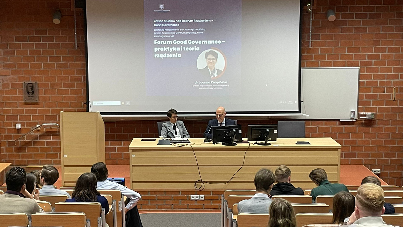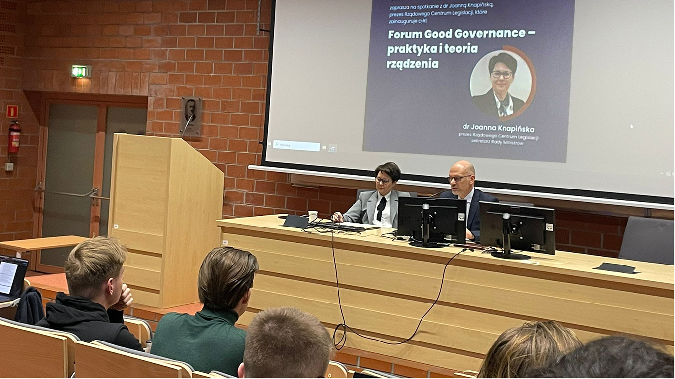 18 listopada 2025 r. na Wydziale Prawa i Administracji Uniwersytetu Warszawskiego rozpoczął się cykl spotkań „Forum Good Governance – praktyka i teoria rządzenia”. W wydarzeniu wzięła udział dr Joanna Knapińska, Prezes Rządowego Centrum Legislacji i sekretarz Rady Ministrów.