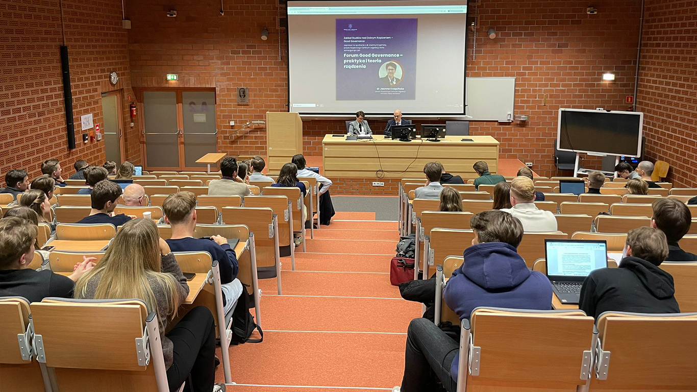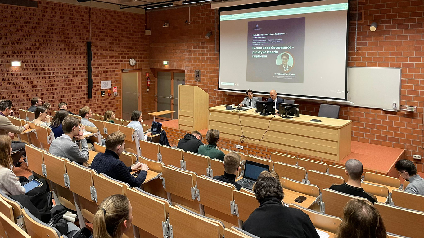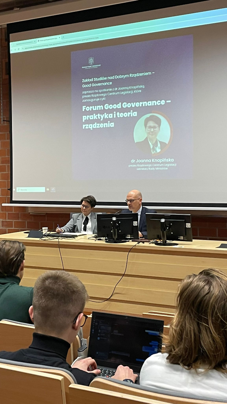 18 listopada 2025 r. na Wydziale Prawa i Administracji Uniwersytetu Warszawskiego rozpoczął się cykl spotkań „Forum Good Governance – praktyka i teoria rządzenia”. W wydarzeniu wzięła udział dr Joanna Knapińska, Prezes Rządowego Centrum Legislacji i sekretarz Rady Ministrów.